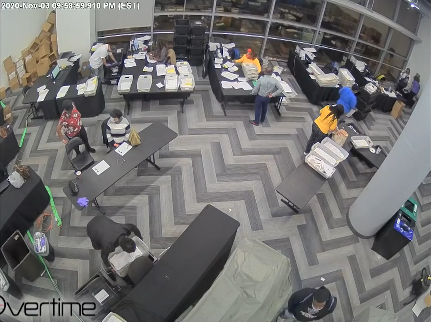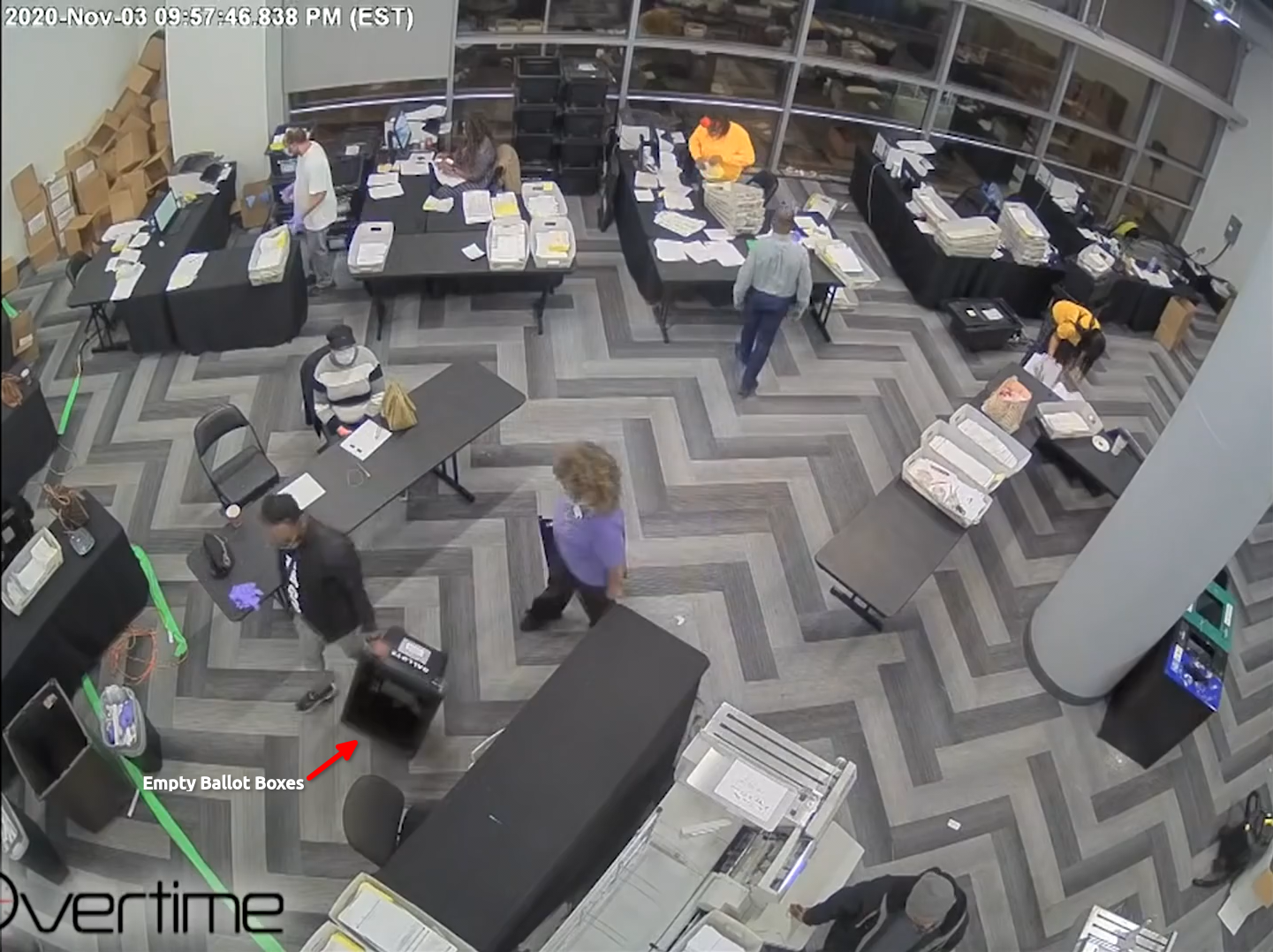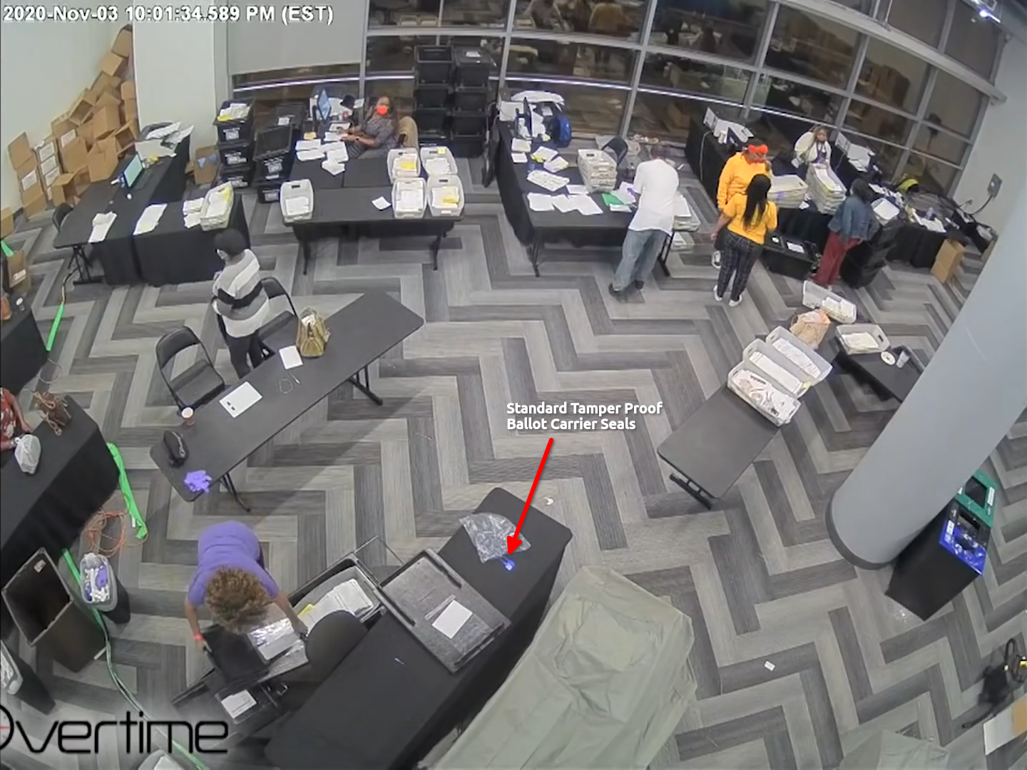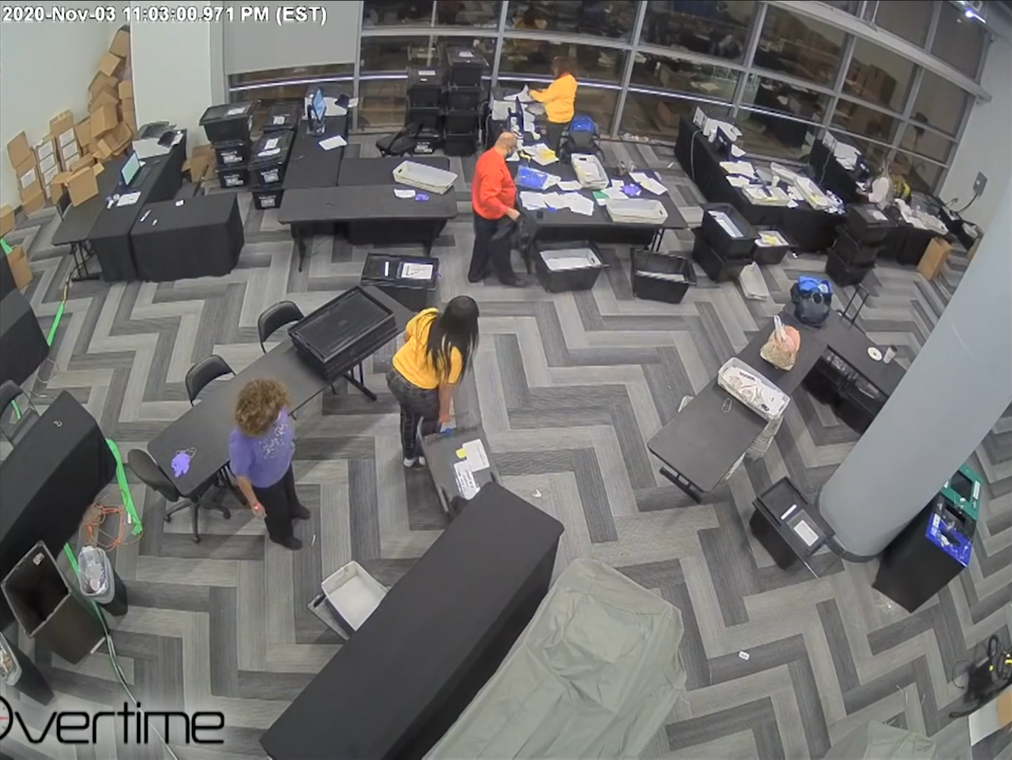 The "Mysterious Ballots" in the State Farm Arena footage are standard ballot carriers that were placed there in full view of the election observers. It is claimed that boxes filled with fraudulent ballots were snuck in under the table and counted after everybody left. This relies on intentional skips over the security camera footage. Here is the complete relevant timeline: