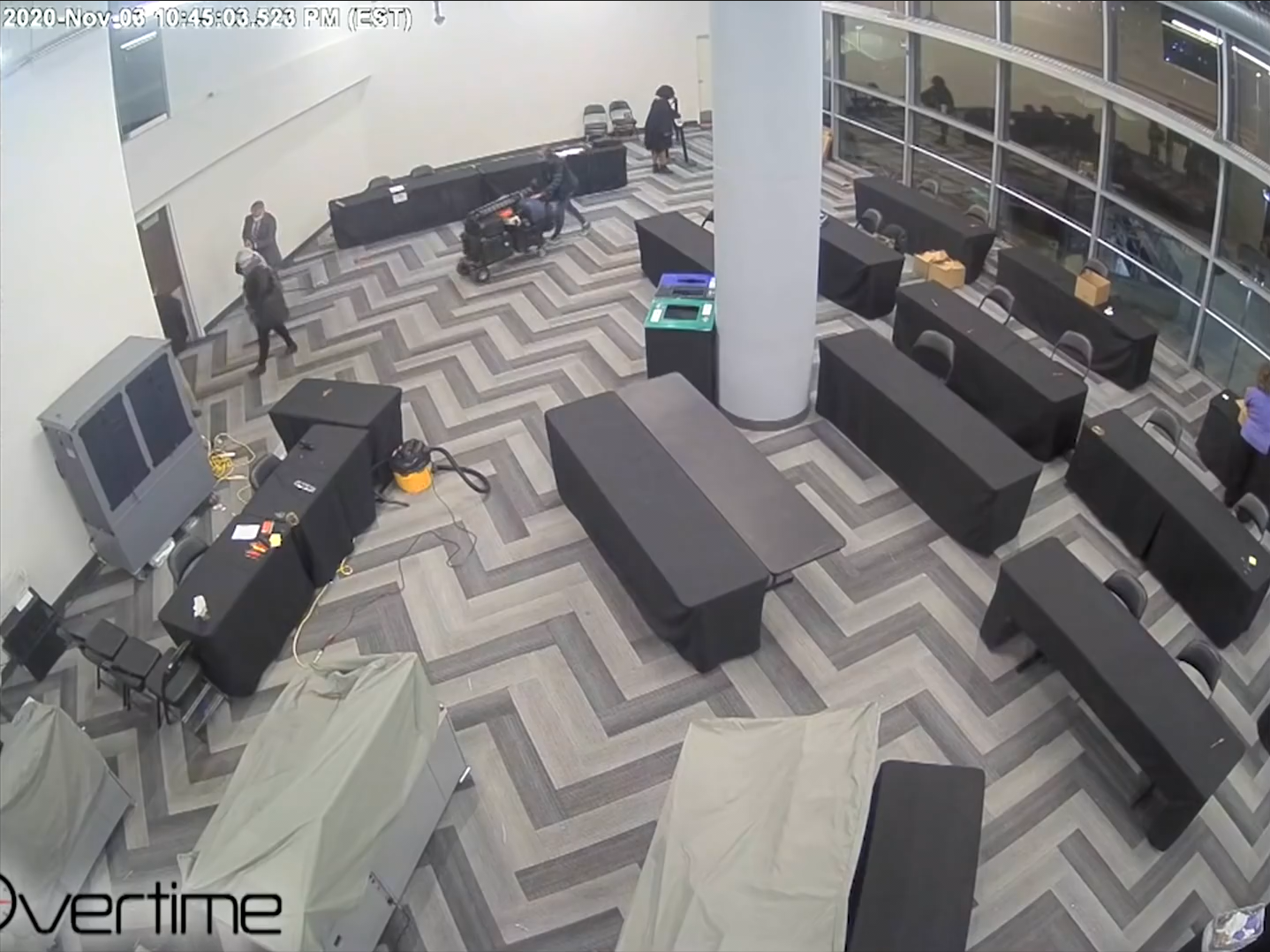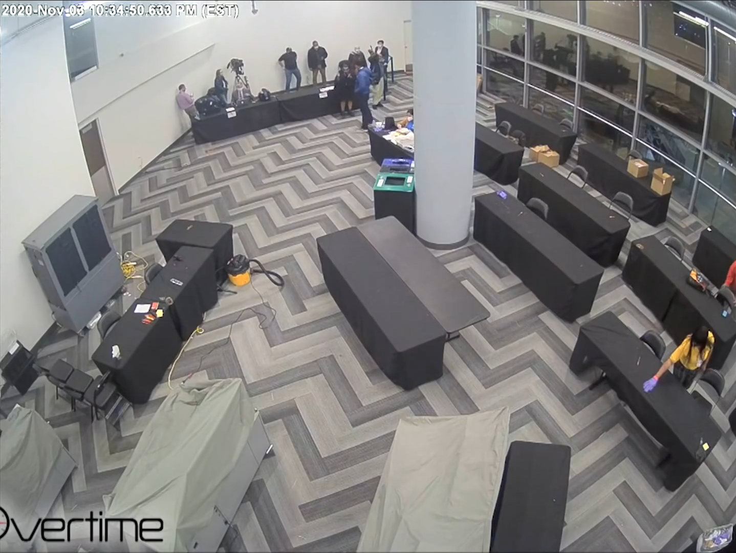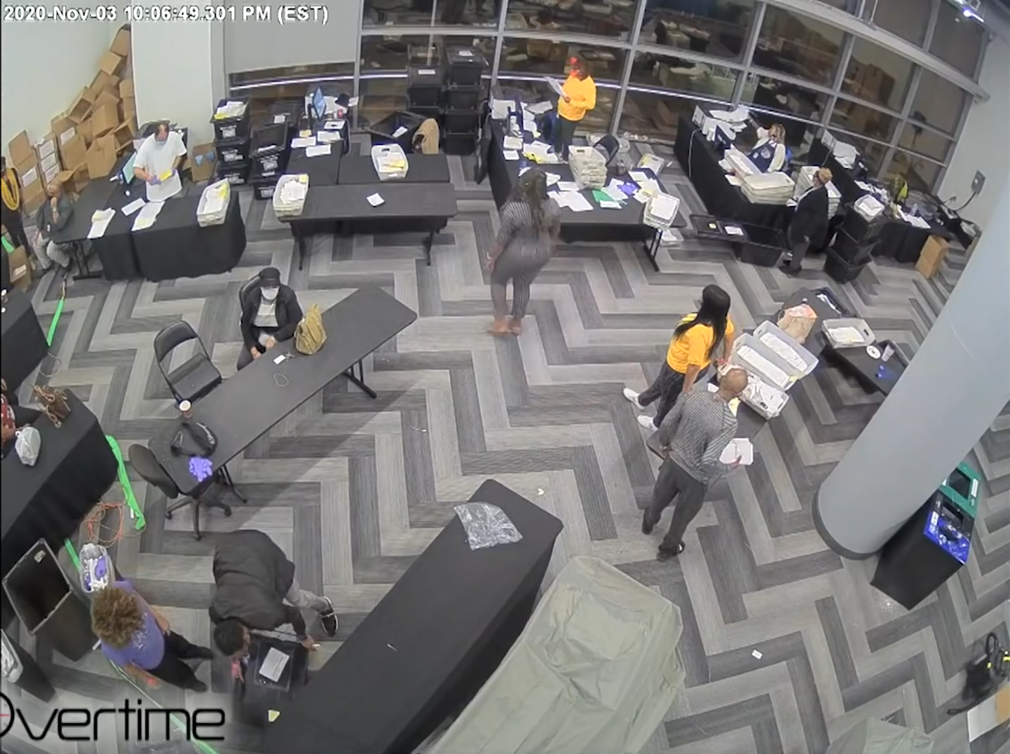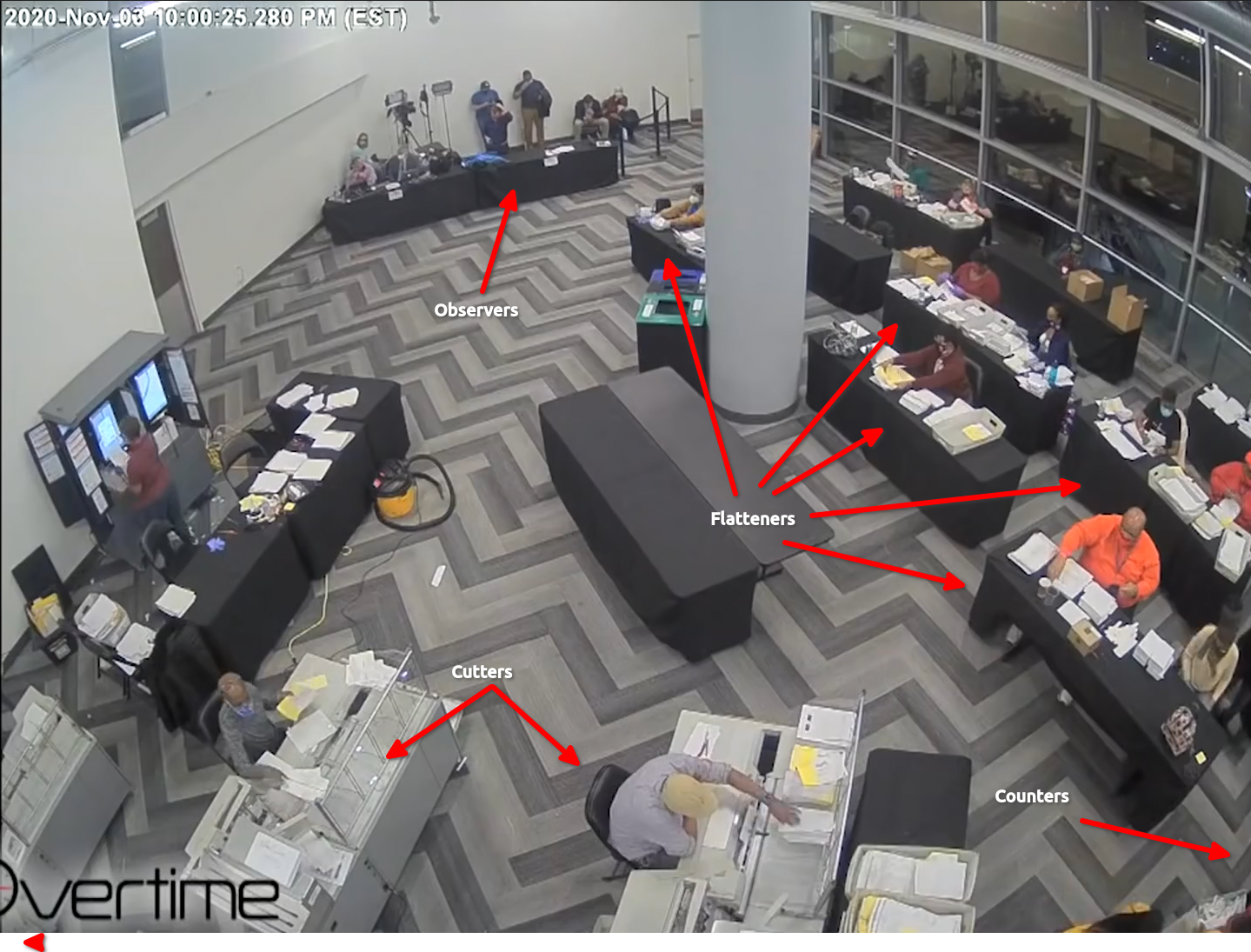 The "Mysterious Ballots" in the State Farm Arena footage are standard ballot carriers that were placed there in full view of the election observers. It is claimed that boxes filled with fraudulent ballots were snuck in under the table and counted after everybody left. This relies on intentional skips over the security camera footage. Here is the complete relevant timeline: